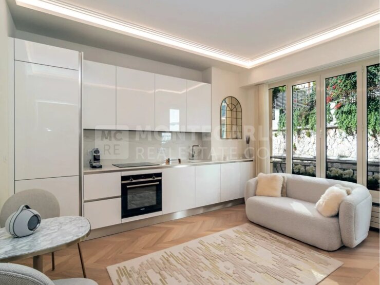 Magnifique appartement de 2 pièces à Monaco offrant une vue panoramique sur la ville et la mer, la propriété s’étend sur un étage et comprend salon, chambre, cuisine, salle de bain et balcon.