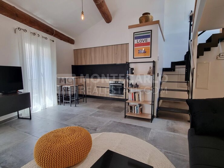 Sur le Rocher proche de la Mairie, 2 pièces entièrement rénové de 45m2, atypique, comprenant entrée, séjour avec cuisine ouverte, chambre avec sall...