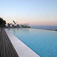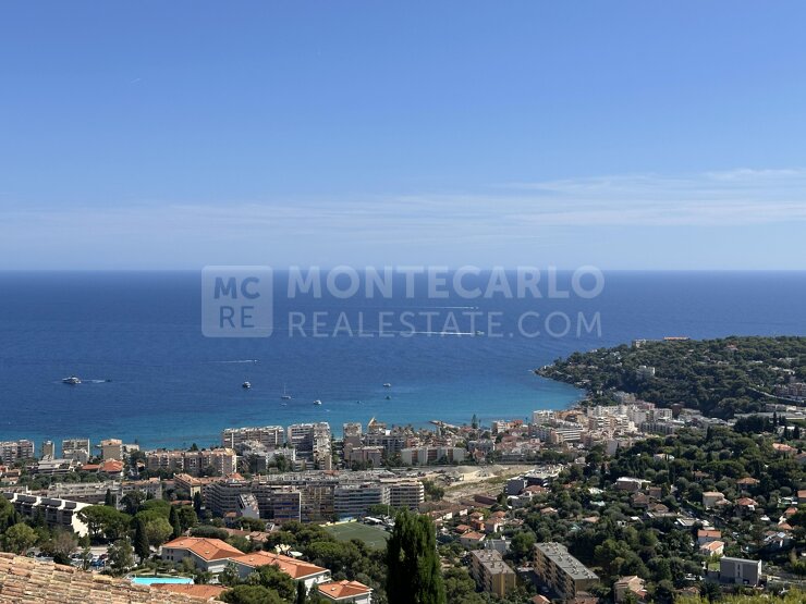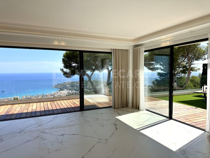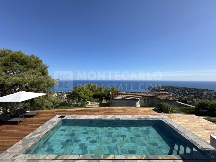 Au calme absolu, au sein d’un domaine privé et sécurisé, cette belle villa neuve contemporaine de 238 m² est implantée en position dominante et offre une vue panoramique magique sur la mer, du Cap Martin à Menton.