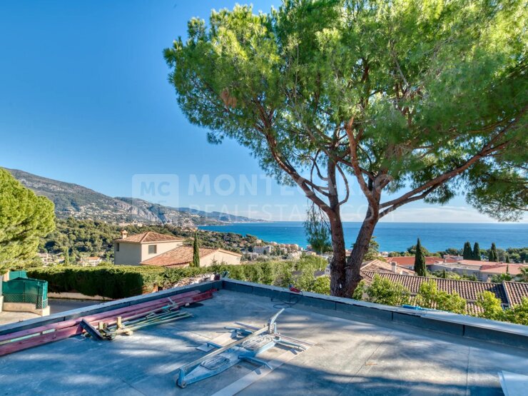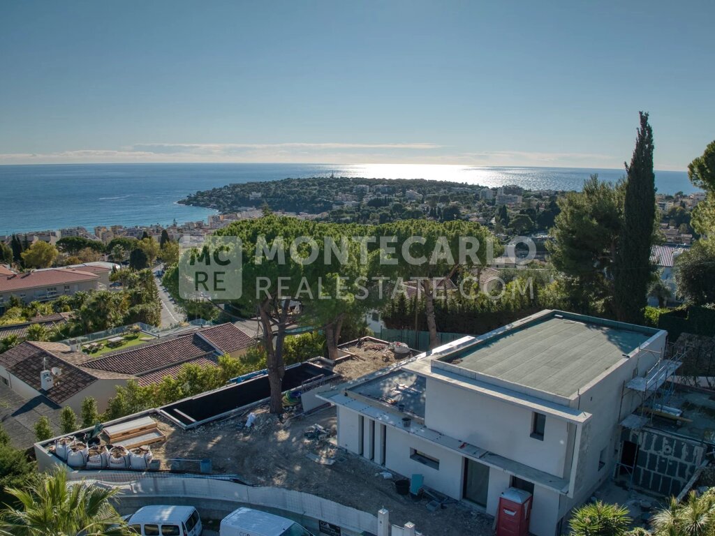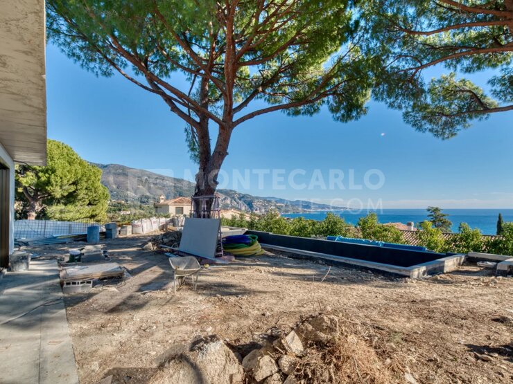 Roquebrune Cap Martin - VILLA Neuve CONTEMPORAINE VUE MER AVEC PISCINE À DÉBORDEMENT, 3 parkings garage Roquebrune-Cap-Martin, à quelques minutes de Monaco, édifiée sur terrain arboré de 1 000 m2, au cœur d’un secteur résidentiel calme et prisé, dans un domaine privé, somptueuse villa contemporaine d’environ 265 m2, terrasse de 65 m2, conjuguant modernité et confort, orientée plein sud, vue mer imprenable.
