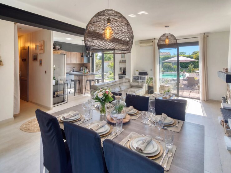 Pensée pour recevoir et profiter pleinement des beaux jours, la propriété s’ouvre sur un vaste espace de vie traversant réunissant salle à manger, cuisine ouverte et salon avec cheminée. Cet ensemble lumineux prolonge naturellement la vie vers l’extérieur, où terrasse, piscine et jardin composent un lieu idéal pour des journées ensoleillées comme pour des soirées d’été en toute convivialité.