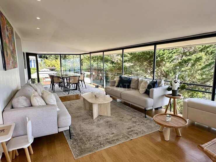 Au niveau inférieur, un appartement indépendant avec séjour, cuisine ouverte, chambre et salle de bains permet d’accueillir famille ou personnel dans un confort total. En complément, une maison d’invités distincte propose un espace cosy composé d’un séjour, d’une chambre et d’une salle de douche.