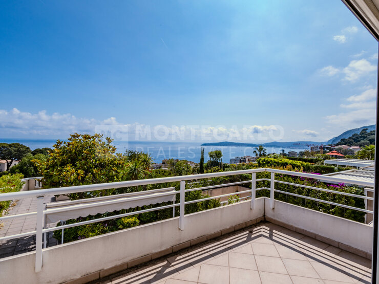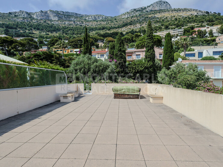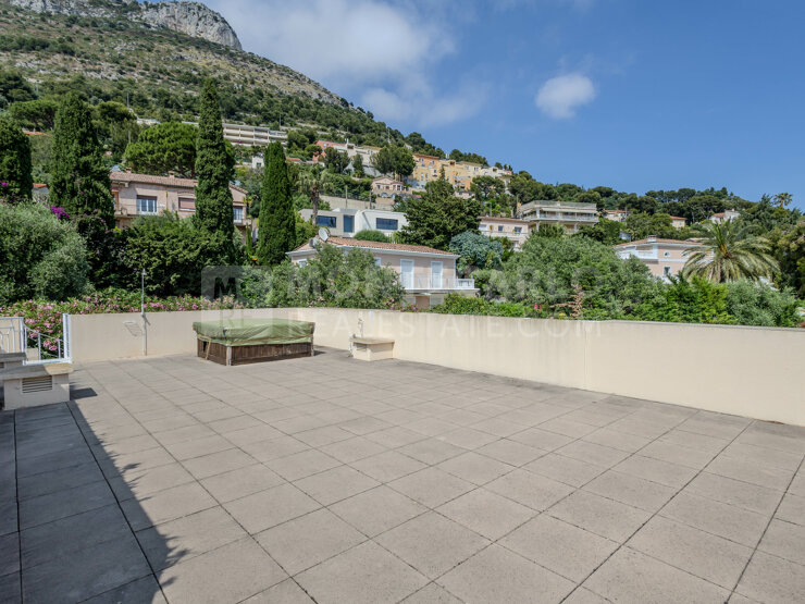 CAP D’AIL - Exclusivité Monaco Properties, Duplex Penthouse avec toit terrasse à seulement 2 minutes à pied de Cap d’Ail et 2 Km de Monaco, dans un décor naturel, au sein d’un parc de 1.2 hectares plantés d’oliviers, d’eucalyptus, découvrez de votre terrasse une vue magnifique largement ouverte sur la mer et le Cap-Ferrat.