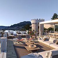 Ce duplex est composé comme suit : un hall d'entrée donnant sur le séjour, d'une cuisine entièrement équipée, deux chambres avec armoires intégrées, une salle de douche en marbre avec rangement, toilettes invités, deux balcons et une loggia de 17.20 m² qui donne accès, par le biais d'un escalier extérieur, à un toit terrasse de 35 m² habillé de bois exotique, agrémentée de plantes, disposant d'un jacuzzi et d'une exposition à 360° avec vue sur la baie de Monaco.