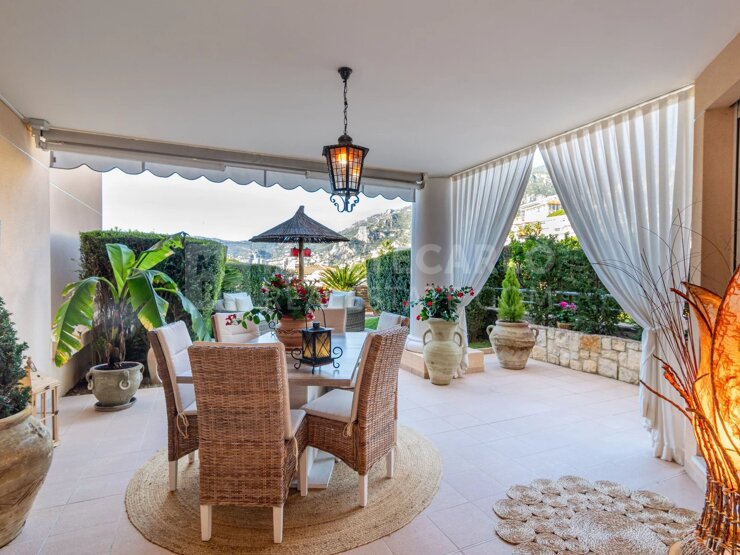 L'appartement s'étend sur un jardin de 80 m2, avec une terrasse de 28 m2, tous deux soigneusement aménagés et meublés. A cela s'ajoute une vue sur la mer et Monaco et les parties communes de l'immeuble qui s'harmonisent parfaitement avec le style de la maison.