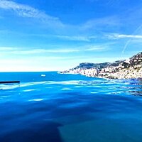 Grande terrasse d'un côté avec vue mer et Tennis et de l'autre côté un jardin intérieur.