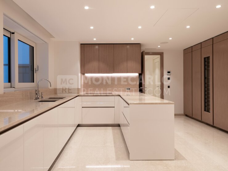 Le T6B+ comporte quatre chambres en suite, un bureau ainsi qu'un espace dédié au service. Sa cuisine séparée s'ouvre sur un vaste séjour, avec ses baies vitrées et un balcon orienté plein sud offrant une vue sur la Méditerranée. La profondeur exceptionnelle du balcon crée un véritable espace de vie extérieur. Les ameublements et les matériaux sont de la meilleure qualité, intégralement réalisés et assemblés par des artisans de grand talent. La gestion de la luminosité, de la climatisation et du vidéophone se fait par une domotique ultra-moderne.