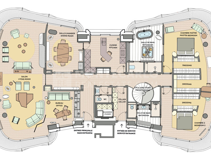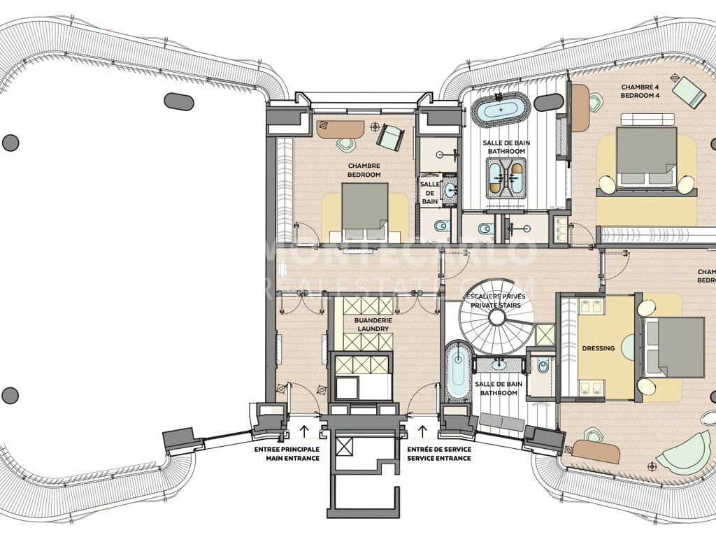 Ce magnifique duplex dans le bâtiment E offre 480 m² de surface habitable, des balcons entourant l’appartement, avec une vue magnifique sur la place du Casino et la mer.