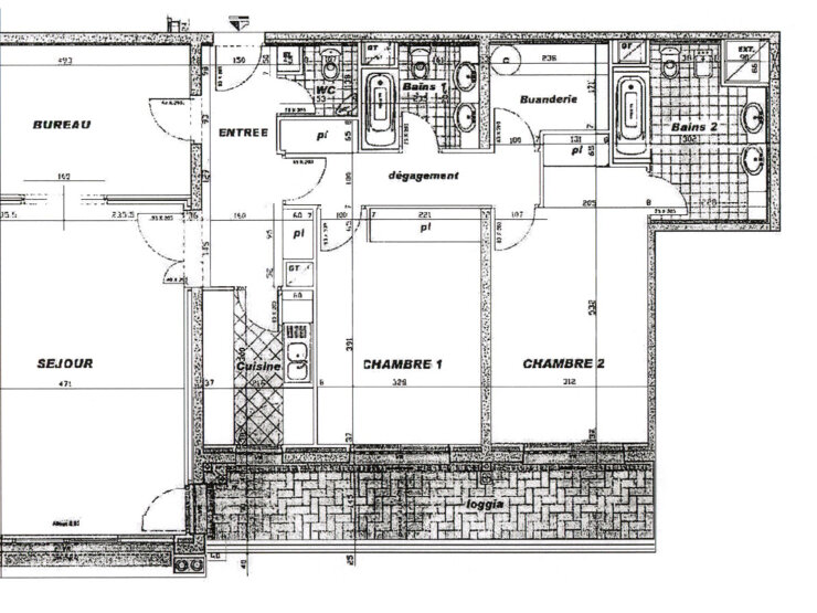 Entrée, Grand Séjour, Salle à manger ou Bureau ou 3ème chambre, 2 Chambres, 2 Salles de bains, Cuisine équipée, Buanderie, WC invités, nombreux Placards, Dégagement, Loggia