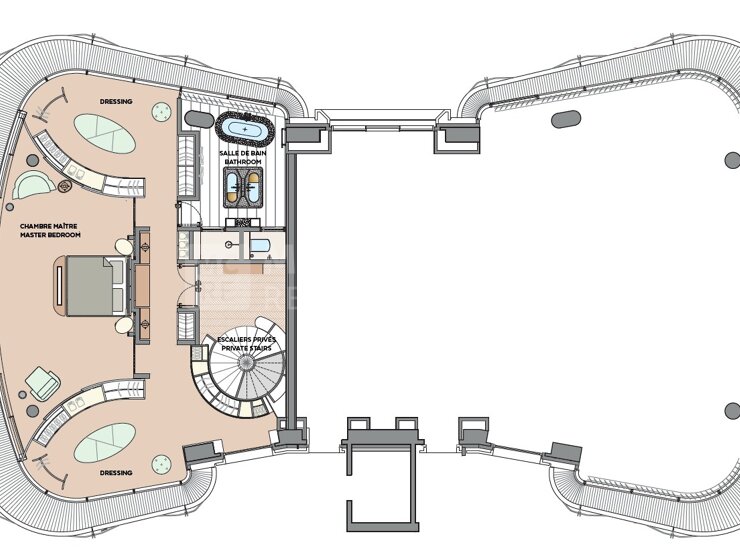 Au deuxième étage : Une chambre de Maître avec un dressing Madame et un dressing Monsieur, un spacieuse salle de bain.