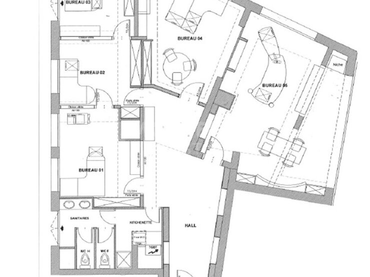 Grand bureau disposant de 5 zones de travail. Superficie totale de 147m2 environ