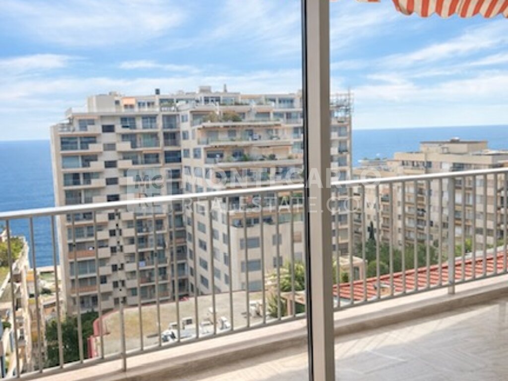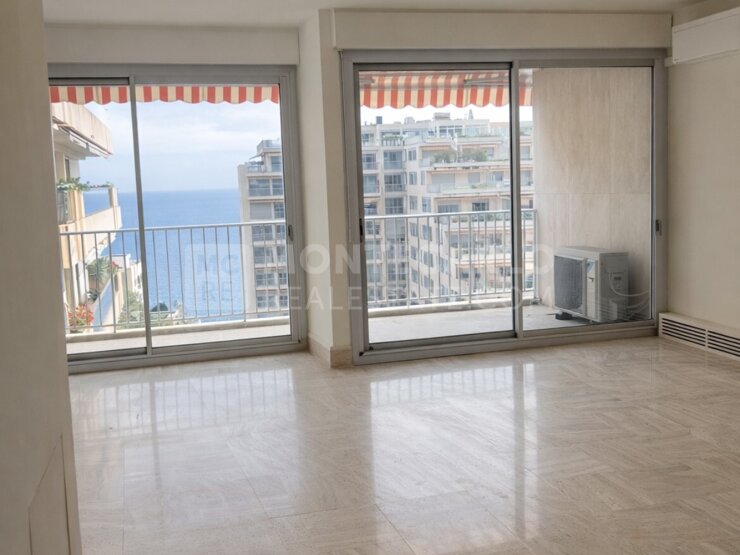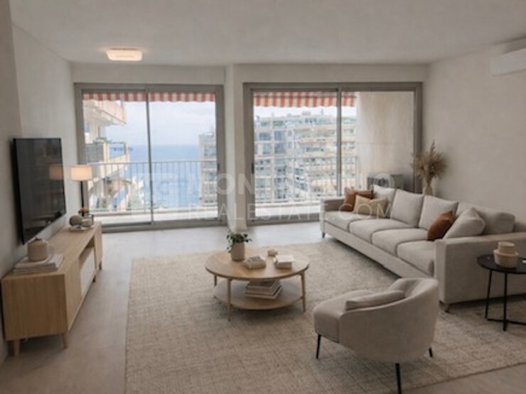 Une belle entrée avec placards s'ouvrant sur un large double séjour avec terrasse vue mer et et cuisine ouverte équipée.