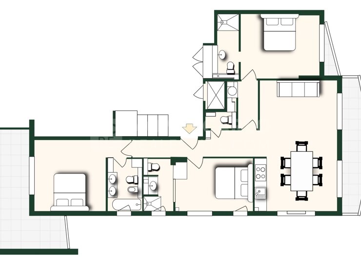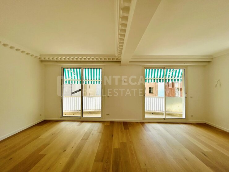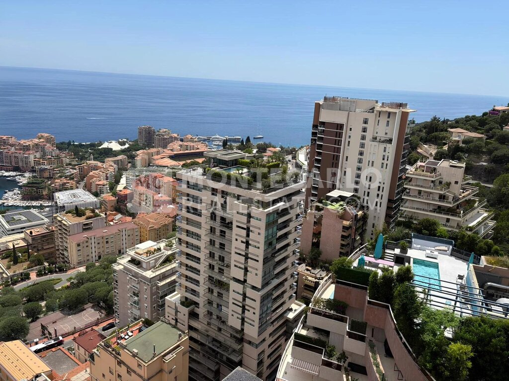 L’appartement est lumineux au premier étage avec ascenseur, offre un belle aperçu mer et Rocher. Ce 4 pièces avec de belles hauteurs sous plafond se compose d’un double séjour avec cuisine ouverte donnant sur une terrasse, de deux chambres avec salles de bains attenantes, d'un WC invités, la troisième chambre dispose de sa propre salle de bain et d'un espace extérieur avec une pergola.