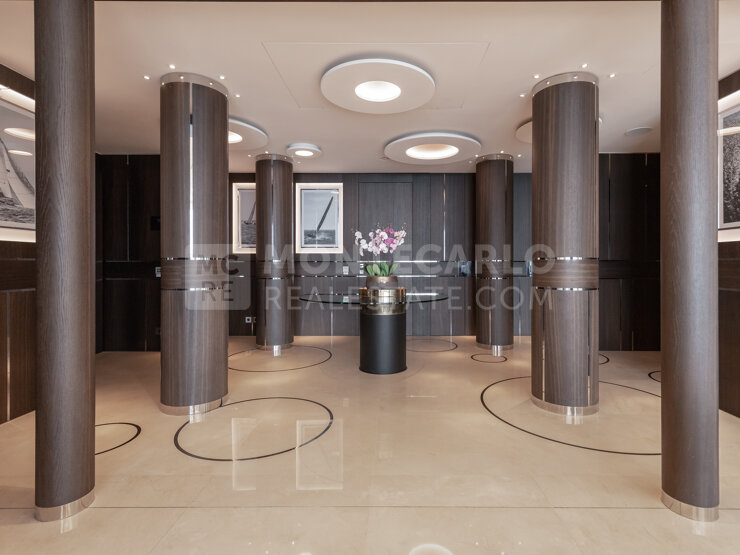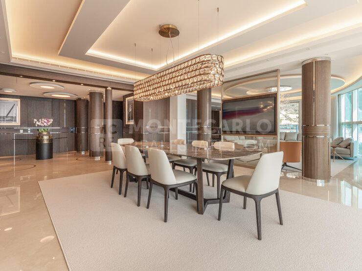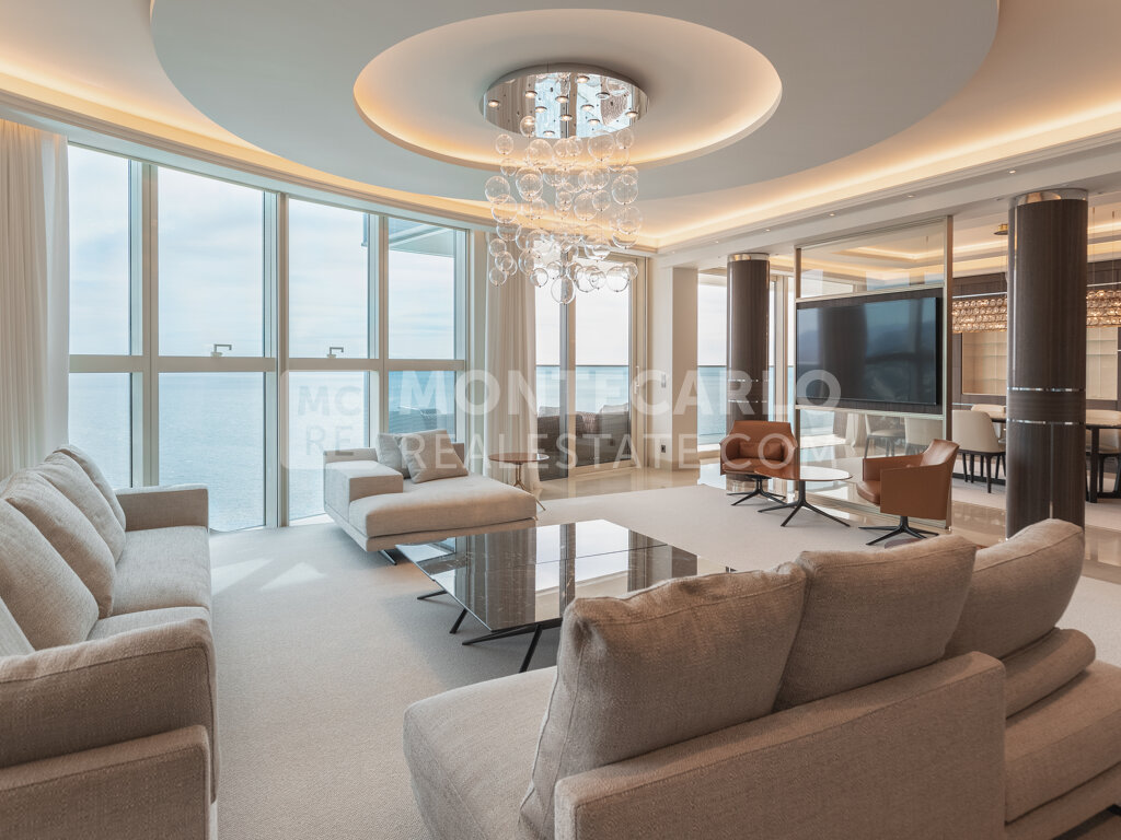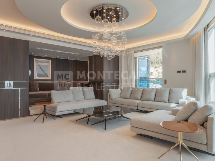 L'appartement comprend un majestueux hall d'entrée ouvrant sur un double séjour lumineux, une cuisine moderne entièrement équipée, quatre chambres spacieuses, chacune avec sa propre salle de bains et son dressing. Deux magnifiques et larges terrasses offrent des vues spectaculaires sur la Méditerranée, les côtes monégasques, françaises et italiennes.