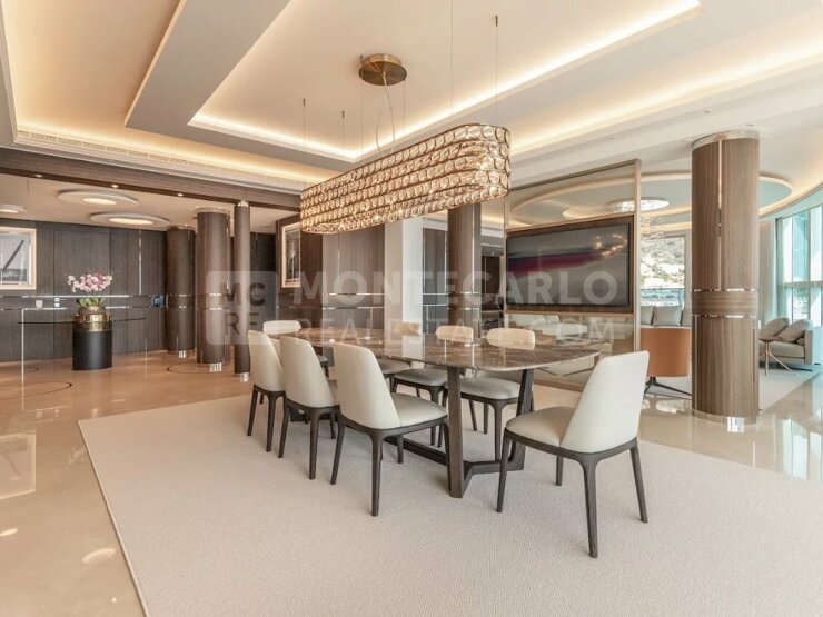 L'appartement comprend un majestueux hall d'entrée ouvrant sur un double séjour lumineux, une cuisine moderne entièrement équipée, quatre chambres spacieuses, chacune avec sa propre salle de bains et son dressing. Deux magnifiques et larges terrasses offrent des vues spectaculaires sur la Méditerranée, les côtes monégasques, françaises et italiennes.