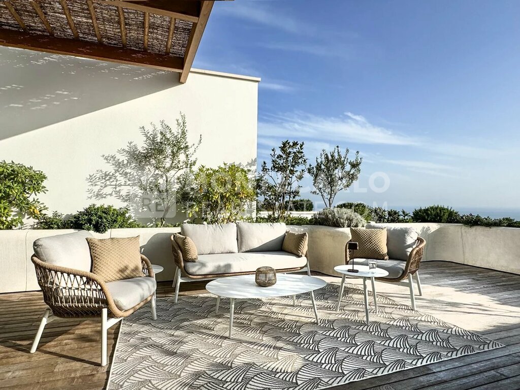 L'appartement dispose d'une terrasse spacieuse de 53 m² qui offre une vue panoramique imprenable sur la mer.