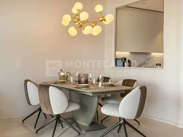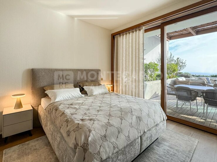 Bienvenue dans la résidence L'Exotique, dont le lobby donne déjà le ton d'un habitat luxueux. Des revêtements en bois précieux, des luminaires élégants, des sièges confortables et des détails raffinés créent une atmosphère accueillante et offrent un premier aperçu du haut niveau et du design exquis de l'ensemble du bâtiment. Vous bénéficiez également d'un service de conciergerie 24h/24 et 7j/7, d'une salle de fitness, d'un espace spa avec piscine intérieure et hammam. Un parc privé, appartenant à l'immeuble et planté de nombreux oliviers, vous offre une vue impressionnante sur la Méditerranée et la Principauté. Ce magnifique appartement de trois pièces offre une vue imprenable sur la mer. Grâce à son orientation sud-ouest, l'appartement bénéficie d'un ensoleillement optimal et impressionne par son design de qualité. L'appartement dispose d'un élégant double salon et d'une élégante cuisine entièrement équipée d'appareils de première classe. Le salon s'ouvre sur une terrasse spacieuse où une grande table à manger invite à des soirées conviviales. Un espace salon supplémentaire crée une atmosphère de calme et de détente pour vous et vos invités. La chambre à coucher principale impressionne par sa taille, sa lumière naturelle et son dressing-couloir qui offre de nombreuses possibilités de rangement, ce qui ravira particulièrement les femmes. La salle de bain en suite avec chauffage au sol est équipée de carreaux de pierre, d'un double lavabo sur mesure, d'une baignoire et d'une douche. Une deuxième chambre avec salle de douche offre également des matériaux de qualité et un design moderne.