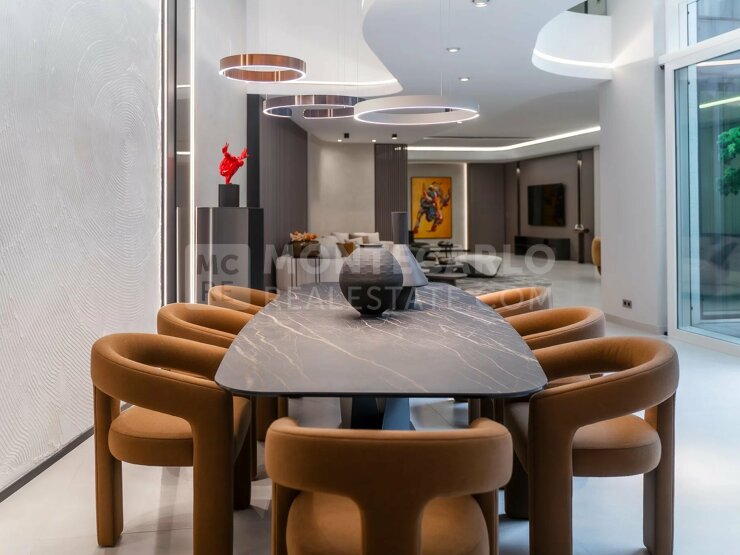 Bienvenue dans cette villa d'exception, idéalement située à deux pas du port Hercule à Monaco. Cette propriété d'une superficie totale d'environ 800 m² a été entièrement rénovée, avec un grand souci du détail et du raffinement. Elle est proposée à la location entièrement meublée et offre un intérieur transformé en véritable chef-d'œuvre grâce à des finitions d'une qualité incomparable. Le principal espace de vie, d'une superficie avoisinant les 300 m², se distingue par ses volumes impressionnants et ses hauts plafonds, créant ainsi une atmosphère à la fois majestueuse et intime. À cet étage, vous trouverez une cuisine ouverte, moderne et entièrement équipée, un patio orné d'un mur d'eau, ainsi qu'une vaste salle à manger. La villa dispose également de deux salons élégants : l'un dédié à l'espace télévision et l'autre, plus chaleureux, doté d'une cheminée. En complément, un superbe espace fitness privé vient parfaire cette offre d'exception. Le premier étage, abrite une somptueuse chambre de maître, accompagnée d'une salle de bains remarquable et d'un dressing ultra-luxueux. Cet étage donne également accès à un spa privé, avec hammam, sauna et salle de repos, offrant un confort digne des plus grands palaces. Par ailleurs, deux suites spacieuses sont réparties sur d'autres niveaux, chacune bénéficiant d'un dressing, d'une salle de bains somptueuse et de terrasses privatives. Enfin, le dernier étage de la villa représente un véritable havre de paix rare à Monaco, avec sa végétation luxuriante, sa piscine privée et son espace de détente : un lieu idéal pour recevoir des invités dans un cadre intime et raffiné.