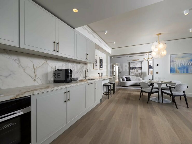 L'appartement se compose comme suit : un hall d'entrée, l'espace de vie avec une cuisine ouverte, entièrement équipée, un coin salon et bureau. 2 chambres à coucher, 2 salles de bains complètes. La terrasse de 179 m2 offre plusieurs espaces de détente et de repas.