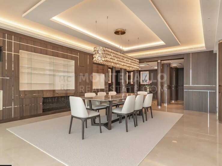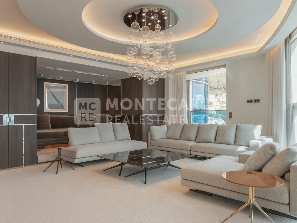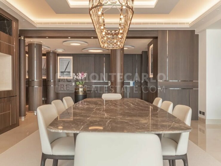 L'appartement comprend un majestueux hall d'entrée ouvrant sur un double séjour lumineux, une cuisine moderne entièrement équipée, quatre chambres spacieuses, chacune avec sa propre salle de bains et son dressing. Deux magnifiques et larges terrasses offrent des vues spectaculaires sur la Méditerranée, les côtes monégasques, françaises et italiennes.