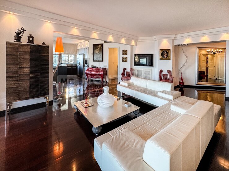 L’appartement bénéficie d'une double exposition sud/est et sud/ouest, il se compose de : d'un hall d’entrée, un grand séjour salle à manger, une cuisine équipée, une buanderie, un bureau, trois chambres avec leur salle de bains, deux parkings et une cave.