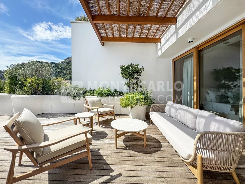 Bienvenue dans la résidence L'Exotique, dont le lobby donne déjà le ton d'un habitat luxueux. Des carreaux de pierre chauds et des revêtements en bois précieux, des luminaires élégants, des sièges confortables et des détails raffinés créent une atmosphère accueillante et offrent un premier aperçu du haut niveau et du design exquis de l'ensemble du bâtiment. Vous bénéficiez également d'un service de conciergerie 24h/24 et 7j/7, d'une salle de fitness, d'un espace spa avec piscine intérieure et hammam. Un parc privé, appartenant au bâtiment et planté de nombreux oliviers, vous offre une vue impressionnante sur la Méditerranée et la Principauté. Ce magnifique appartement baigné de lumière dispose d'un salon avec coin repas qui vous donne accès à une vaste terrasse avec une vue imprenable sur la mer. La chambre à coucher principale offre beaucoup d'espace, de lumière naturelle et de nombreux placards pour votre garde-robe, ainsi qu'une magnifique salle de bain en pierre avec baignoire, douche et double lavabo. La deuxième chambre, avec sa propre salle de bain, a également accès à la terrasse. La cuisine entièrement équipée est dotée de boiseries et est à la fois fonctionnelle et élégante. La grande terrasse avec plusieurs salons et un coin repas s'étend sur 70 mètres carrés et offre une vue panoramique sur Monaco et le port de Cap d'Ail.