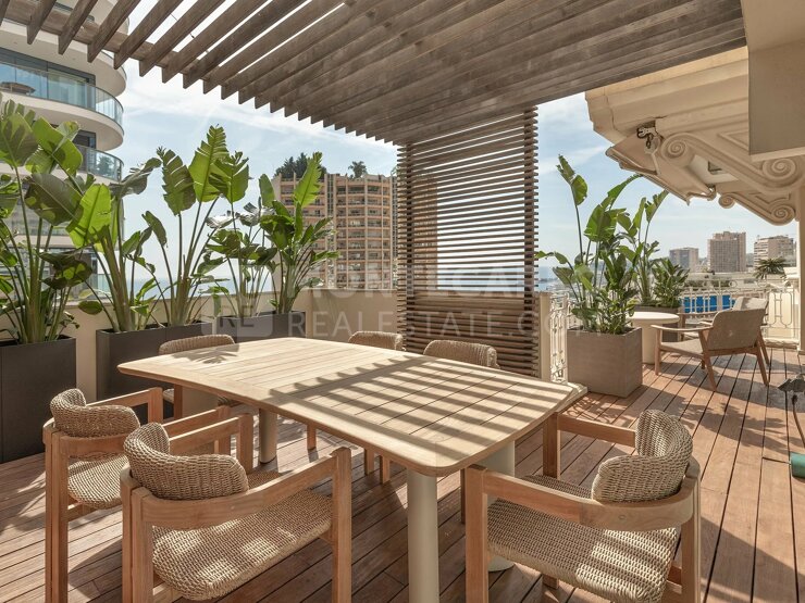 Nichée dans un environnement privilégié, la résidence Les Villas del Sole bénéficie d’un service de conciergerie disponible en continu, 24h/24 et 7j/7. Un somptueux espace piscine situé sur le toit-terrasse vient parfaire l’ensemble, offrant un cadre de détente raffiné avec vue panoramique sur la Principauté. L’emplacement est tout simplement exceptionnel. À quelques pas seulement, vous accédez aisément au prestigieux Monte-Carlo Country Club, aux plages emblématiques du Larvotto, ainsi qu’à la nouvelle école internationale, faisant de ce bien une adresse idéale. Situé en dernier étage, cet appartement remarquable de 5 à 6 pièces occupe l’intégralité du plateau, développant une surface intérieure de 460 m², à laquelle s’ajoutent de généreux espaces extérieurs. Dès l’entrée, la luminosité omniprésente et la fluidité des volumes rendent cet appartement unique. L’appartement a fait l’objet d’une rénovation intégrale menée avec un soin extrême, où chaque détail a été pensé pour conjuguer esthétique contemporaine et fonctionnalité. Il est proposé entièrement meublé, avec un ameublement de haute facture alliant lignes épurées et matériaux nobles. La décoration, résolument moderne et raffinée, s’articule autour d’une palette de tons beiges et naturels, qui insufflent aux lieux une élégance apaisante et intemporelle. Le parquet en chêne massif, présent dans toutes les pièces, confère une ambiance chaleureuse et feutrée. Les volumes, particulièrement généreux, créent une sensation de vie en villa, rare en milieu urbain. Les espaces de réception sont vastes et baignés de lumière naturelle, tandis que les chambres, spacieuses et parfaitement agencées, offrent calme et intimité. L’appartement dispose également de nombreux rangements sur mesure, conçus pour optimiser le confort au quotidien.