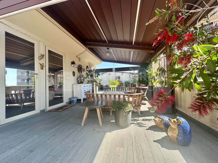 Il se compose actuellement d'un grand séjour avec un coin bureau, une cuisine ouverte entièrement équipée, une confortable chambre, une salle de douche et un WC indépendant. Un escalier intérieur permet d'accéder à une vaste terrasse d'environ 90m², entièrement aménagée, dont un tiers est en pleine propriété. La configuration actuelle des lieux et l'accès font que l'appartement profite de la jouissance privative de l'intégralité de la terrasse.