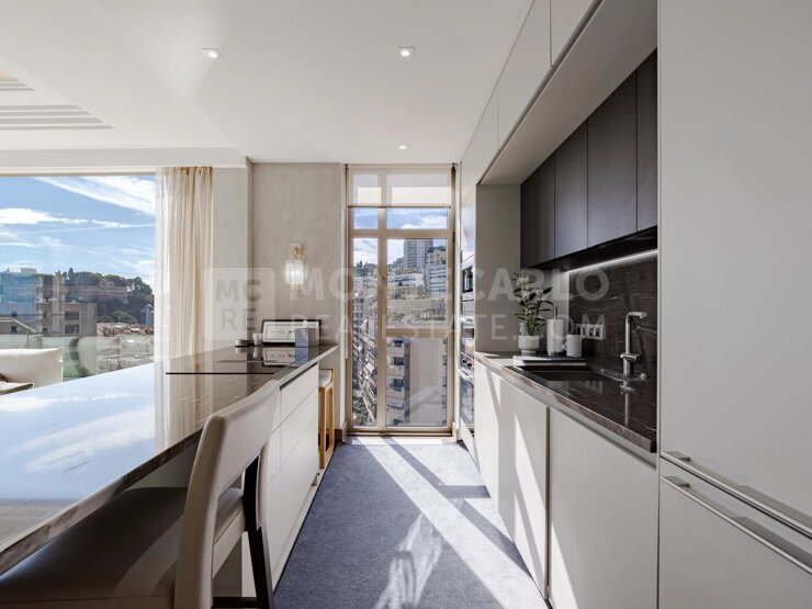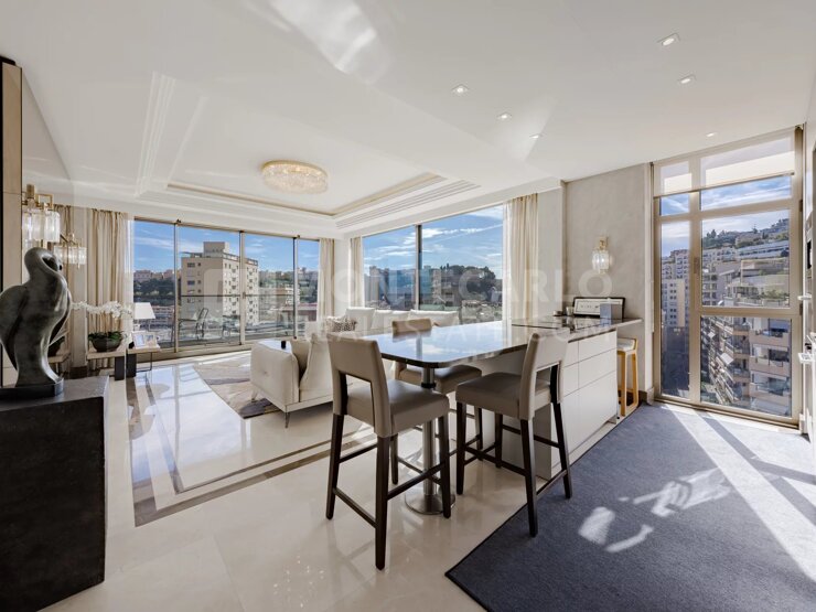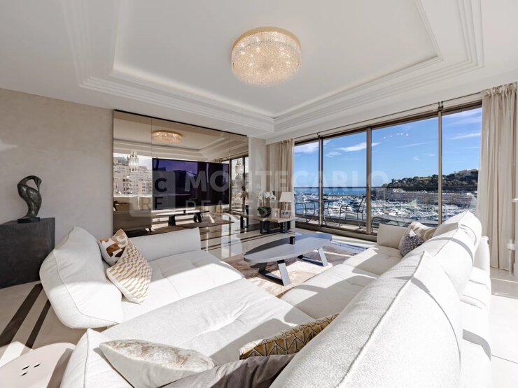 Ce grand appartement familial se trouve dans un immeuble neuf de grand standing avec service de conciergerie 24h/24 et 7j/7. Il comporte 3 chambres pour une superficie totale de 150 m². Il se situe à un étage élevé et offre une vue panoramique sur la mer, le port et le rocher. Il présente des finitions haut de gamme, une cuisine équipée une place de parking ainsi qu’une cave.