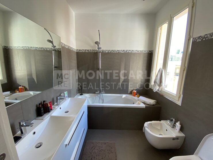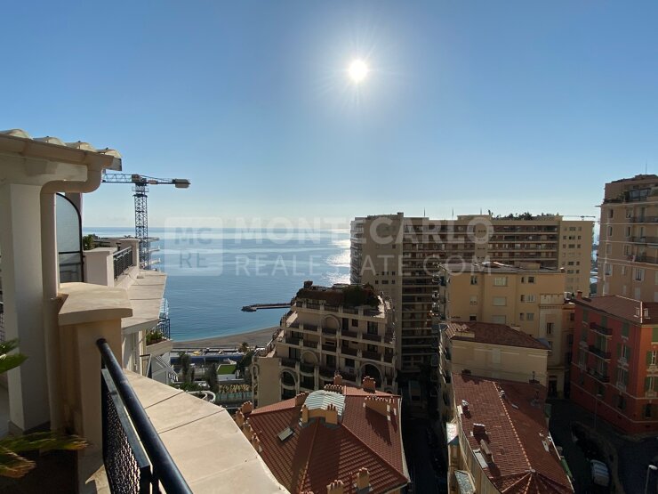 Eden Azur Penthouse luxueusement rénové avec terrasse sur le toit dans un quartier résidentiel orienté vers le sud avec vue panoramique sur Monaco, le Palais princier et la mer.