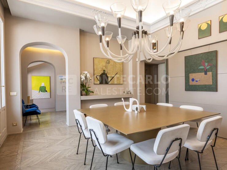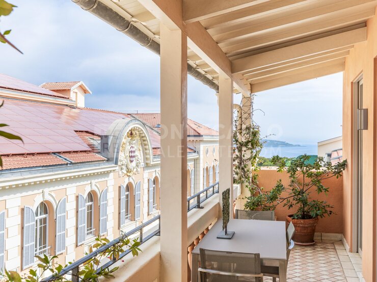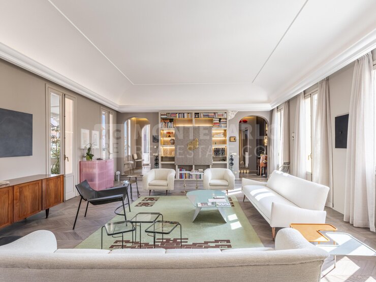 Dés l'entrée, le vaste séjour traversant baigné de lumière avec ses grandes portes-fenêtres offre une belle hauteur sous plafond, le tout s’ouvrant sur une terrasse ensoleillée au charme méditerranéen, parfaite pour des instants de détente face aux toits de Monaco ou à la mer.