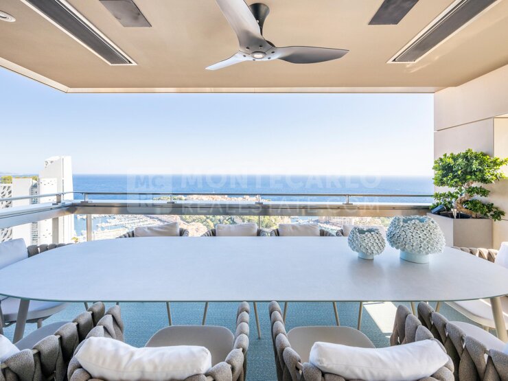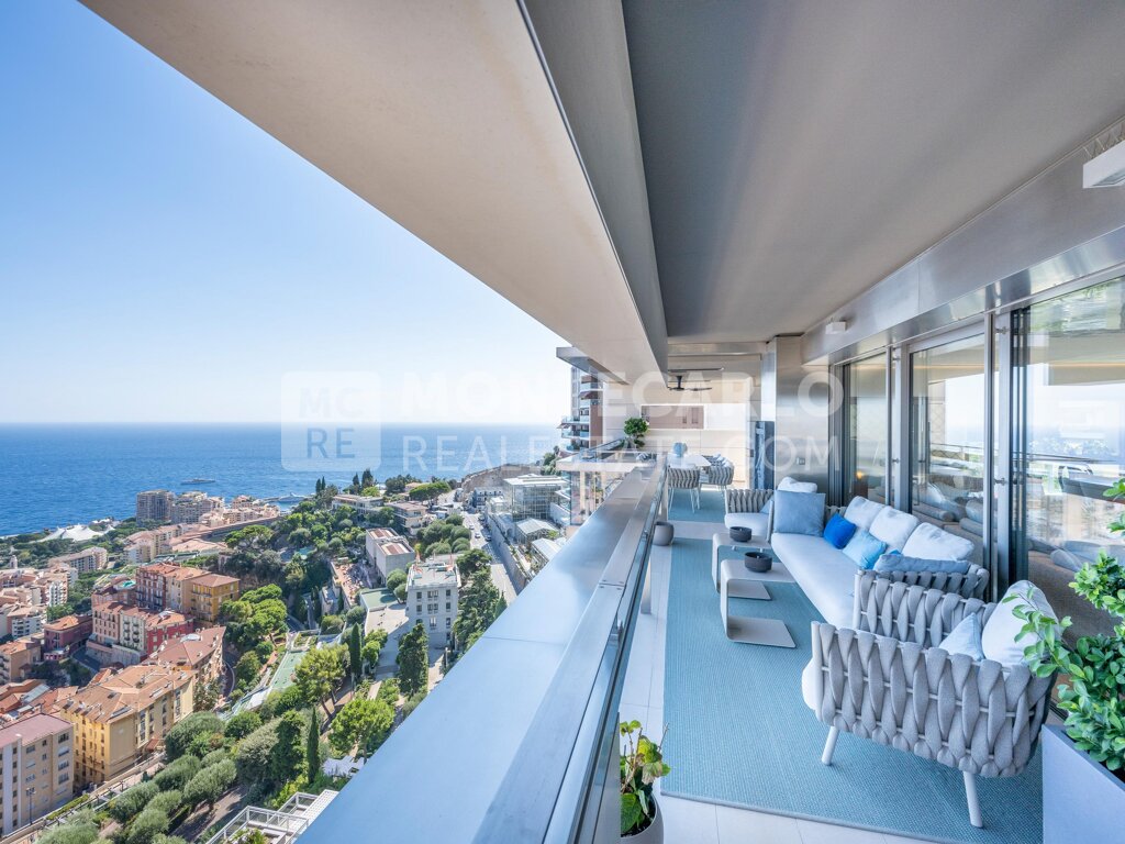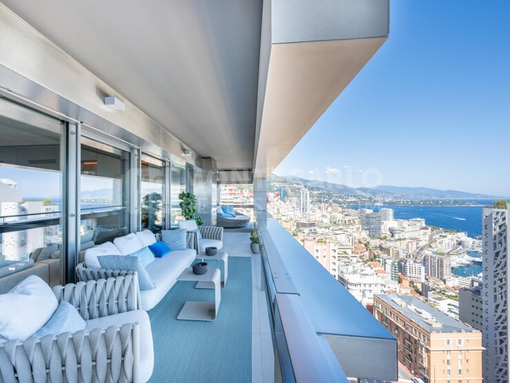 L’appartement dispose d’un vaste espace de vie avec un salon ouvrant sur une grande terrasse, offrant une vue panoramique à couper le souffle sur la Principauté, le Palais princier et l’infini bleu de la mer Méditerranée.