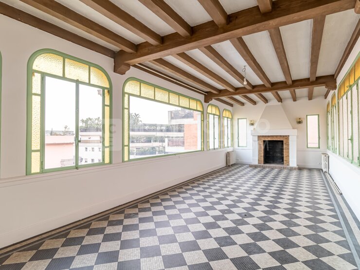 Une chambre de service avec escalier privatif permet d’accéder à une grande terrasse, dotée d’une véranda et d’une cheminée, offrant un espace de vie extérieur privilégié.