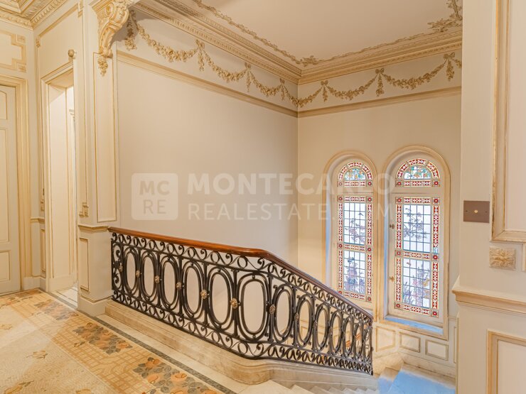 Un second escalier, à la fois majestueux et raffiné, orné de vitraux et d’une rampe en fer forgé, conduit à l’espace nuit. Celui-ci comprend une somptueuse suite parentale avec trois fenêtres jumelées, une chambre avec cheminée en marbre, une chambre double avec douche, ainsi que deux salles de bains. Une pièce supplémentaire avec vasque en mosaïque complète cet étage.