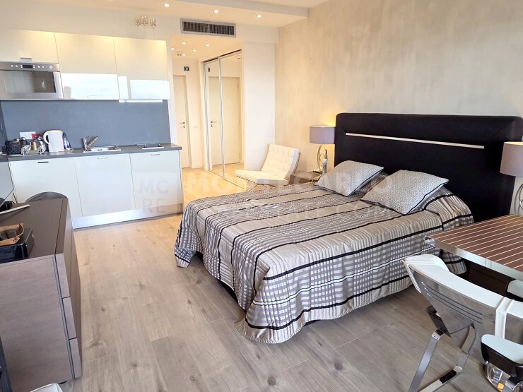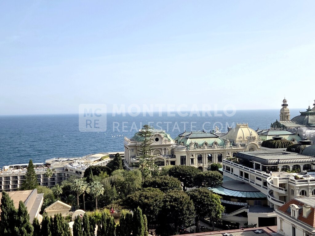 Situé en étage très élevé d'une résidence de luxe en plein cœur du Carré d'Or, cet appartement entièrement rénové et meublé bénéficie d'une incroyable vue panoramique sur la mer et la Place du Casino.