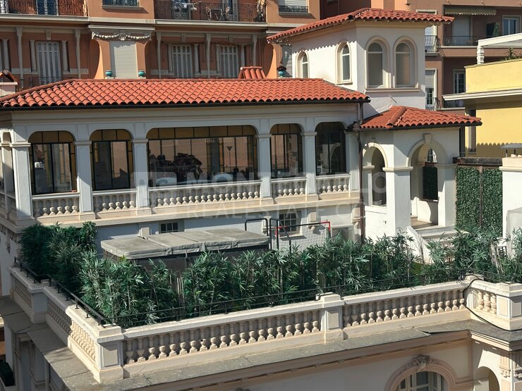 Vaste terrasse sur le toit avec une orangerie/véranda/galerie de grande taille avec une cheminée et vue mer.