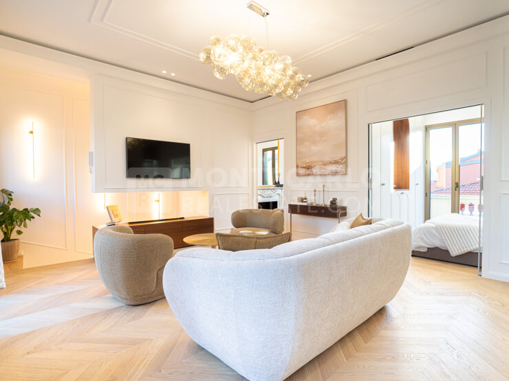 Entre la Place du Palais et la Mairie, cet appartement totalement rénové séduit par son authenticité et son emplacement exceptionnel, au sein du quartier historique du Rocher.