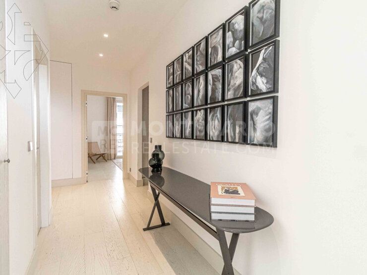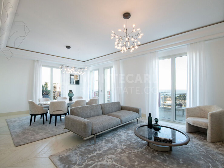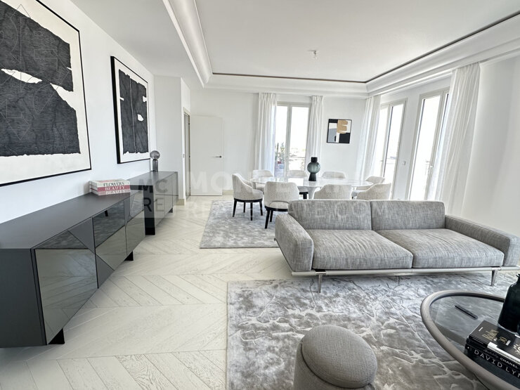 L’appartement, entièrement aménagé avec des meubles contemporains de luxe, se déploie sur deux niveaux et offre une vue panoramique à couper le souffle sur la mer et le Rocher.