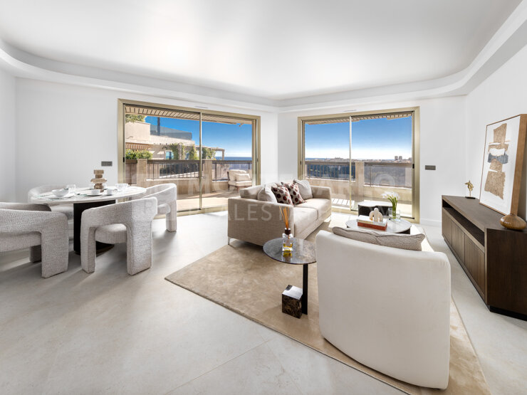 Ce superbe appartement a été entièrement rénové et est vendu entièrement meublé avec goût. Il comprend deux chambres élégantes avec salle de bains privative, une cuisine équipée moderne avec des appareils haut de gamme, ainsi qu’un séjour et une salle à manger lumineux offrant une vue exceptionnelle. La suite principale bénéficie également d’une magnifique vue, alliant confort raffiné et style.