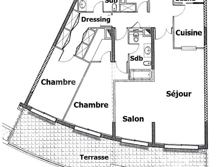 Hall d'entrée, cuisine, buanderie, double séjour, deux chambres avec dressings et salles de bains en suite, toilettes invités, climatisation, double vitrage, grande terrasse.