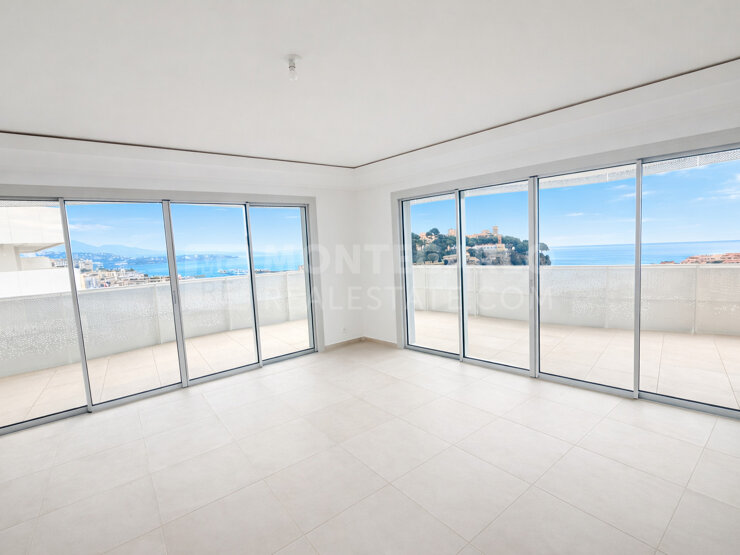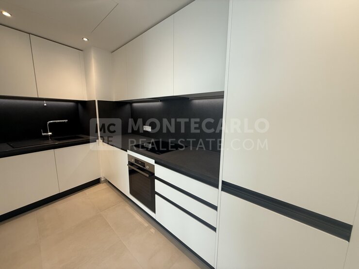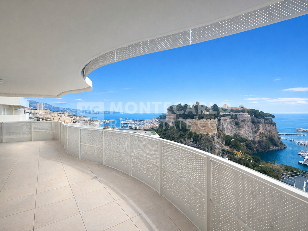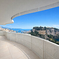 Dans un immeuble neuf situé dans les hauts de la Condamine, au dessus des jardins d'Appoline, ce trois pièces est en étage élevé et bénéficie d'une vue sur la mer, le port Hercules, le Rocher et le port de Fontvieille. Héméra offre le service d'un concierge.