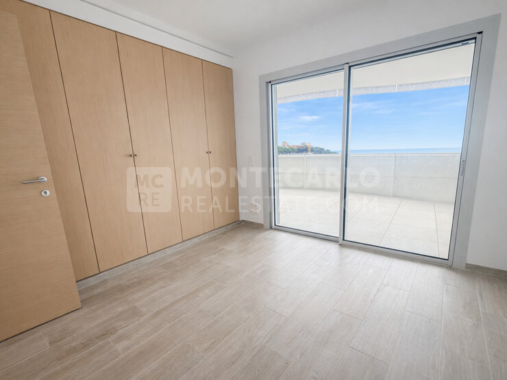 - Une chambre avec placards et accès terrasse offrant une jolie vue mer sur Fontvieille