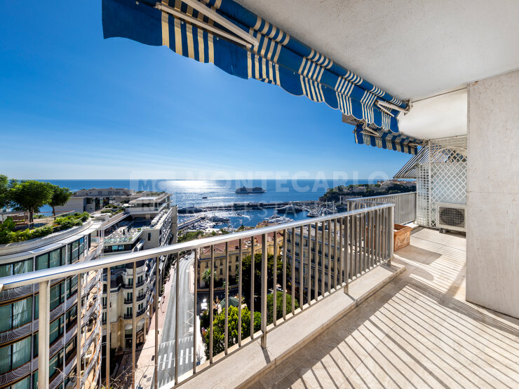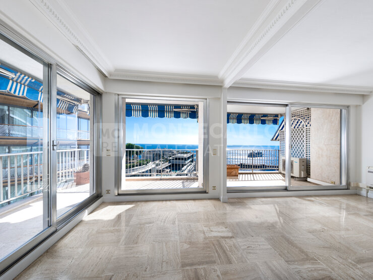 Carré d'Or - Le Sun Tower - 2 pièces Dans un immeuble de standing du Carré d'Or, Bel appartement de 2 pièces situé au 11ème étage. Vue panoramique sur la mer, le port et le rocher de Monaco. Surface totale de 108m². L'appartement se compose de : - Un hall d'entrée, - Un séjour/salle à manger ouvrant sur terrasse, Une chambre avec salle de bain complète, dressing, - Une cuisine équipée, Terrasse Circulaire. Climatisation. Exposition Sud Ouest.
