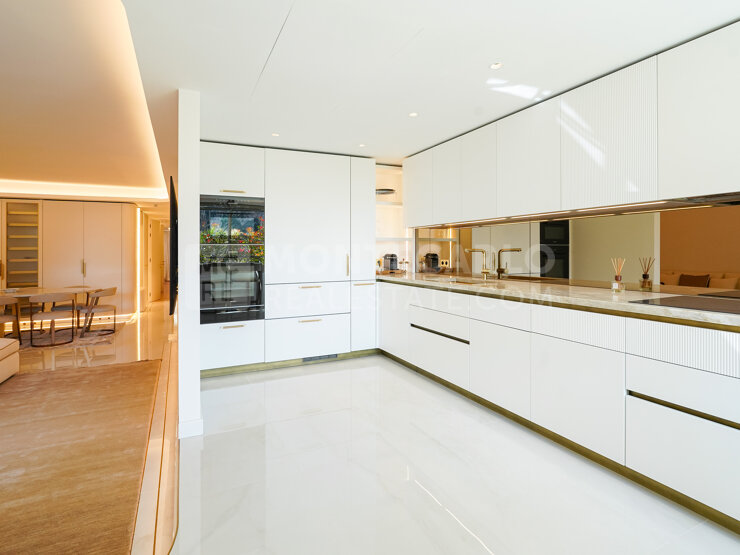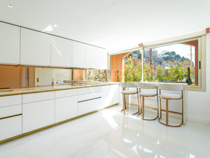 Ce luxueux 4 pièces traversant a été entièrement rénové avec des matériaux haut de gamme et offre des finitions soignées, notamment de très belles menuiseries et des détails raffinés. Sa position en front de mer permet de profiter d’une jolie vue sur la Marina et le Rocher.
