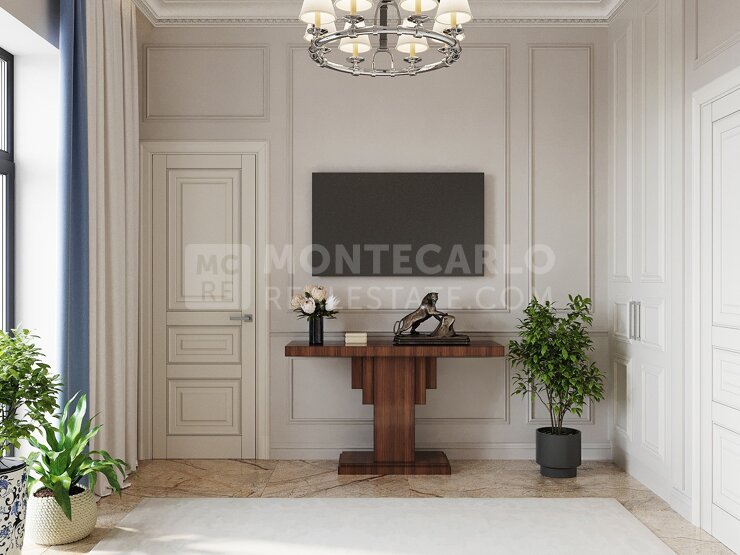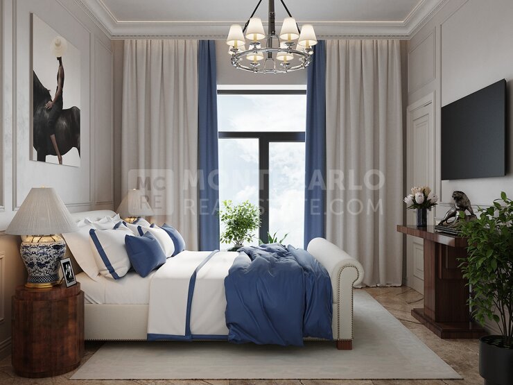 Il se compose d'une entrée, d'un séjour, de deux chambres. Une première chambre avec salle de bains complète. Une autre avec salle de douche et WC. Un WC invités et dressing. Une cuisine indépendante et entièrement équipée, une buanderie. Le séjour et une des chambres s'ouvrent sur un une grande terrasse-patio. l'appartement offre un véritable confort en plein coeur de Monaco et à l'abris des regards.