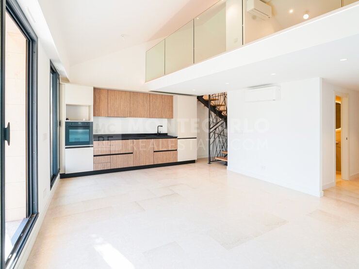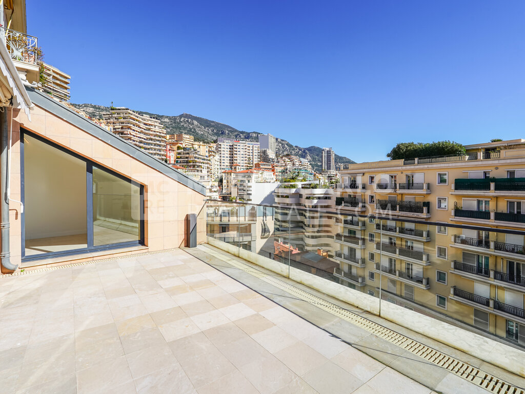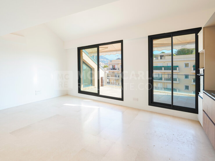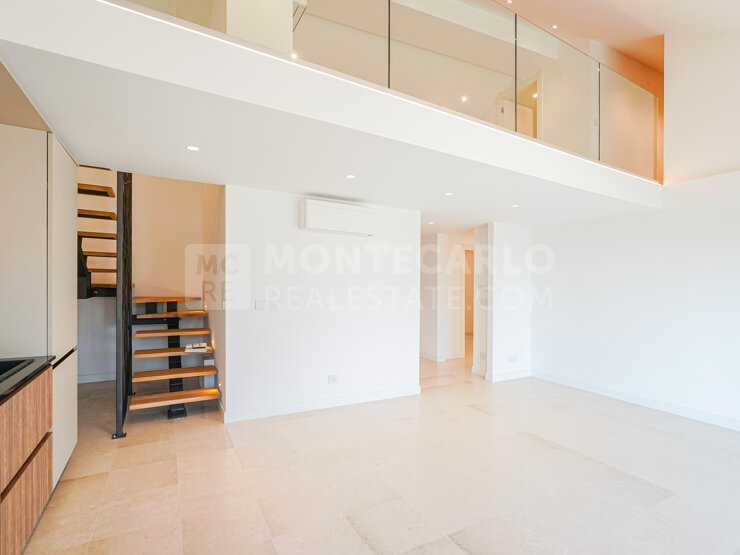 L'appartement réparti sur deux niveaux avec mezzanine a été entièrement rénové et dispose d'une superficie habitable de 132 m². Il se compose d'une entrée, d'un séjour avec espace cuisine entièrement équipé. Deux chambres avec accès à un bel extérieur, une salle de bains et une salle de douche avec toilettes. Au niveau de la mezzanine, un coin nuit avec salle de douche et dressing. Sa position en étage élevé offre une belle vue dégagée sur la ville, le Rocher et un bel aperçu mer. Sa double exposition garantit un bel ensoleillement tout au long de la journée.