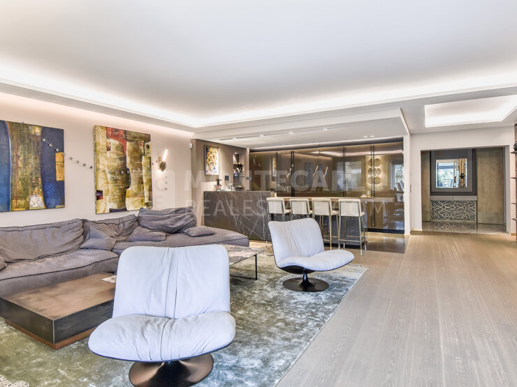 Situé dans le quartier de Fontvieille, dans une belle résidence, élégant appartement de 5 pièces, entièrement rénové avec des matériaux de haute qualité et des prestations luxueuses.