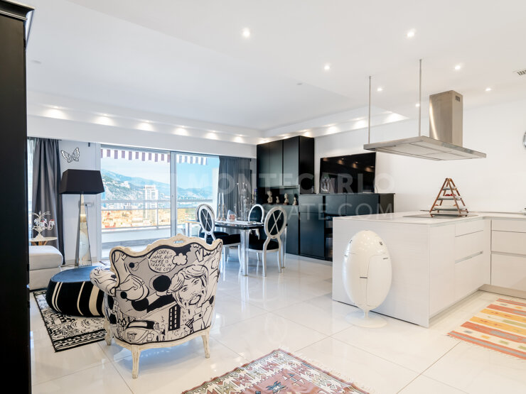D’une surface habitable de 90,68 m² complétée par une terrasse de 27,70 m², cet appartement meublé de 3 pièces, situé en étage élevé, bénéficie d’une belle luminosité et jouit d'une vue panoramique remarquable sur la mer et le port de Monaco.