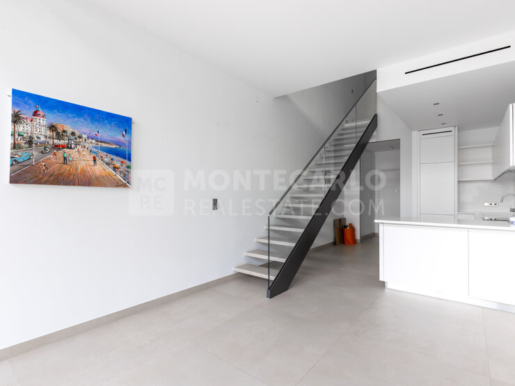 Dans une résidence de standing avec concierge, cet appartement de 2 pièces en duplex au 7ème et 8ème étage avec vue sur le palais de Monaco se compose : d’une entrée, une cuisine américaine équipée, un séjour, un WC et une loggia. À l’étage, un grand dressing, une chambre à coucher avec un balcon et une salle de bains.