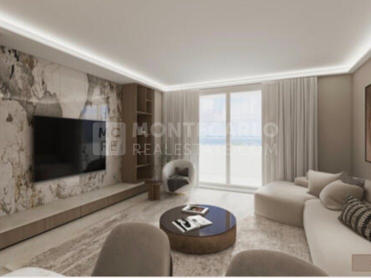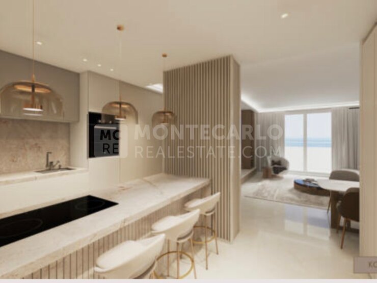 L’espace de vie s’ouvre sur une entrée menant à une cuisine contemporaine haut de gamme avec bar, prolongée par un vaste séjour baigné de lumière, offrant un accès direct à une terrasse. Depuis cet extérieur, le regard embrasse un panorama exceptionnel sur le Port Hercule et le Rocher.